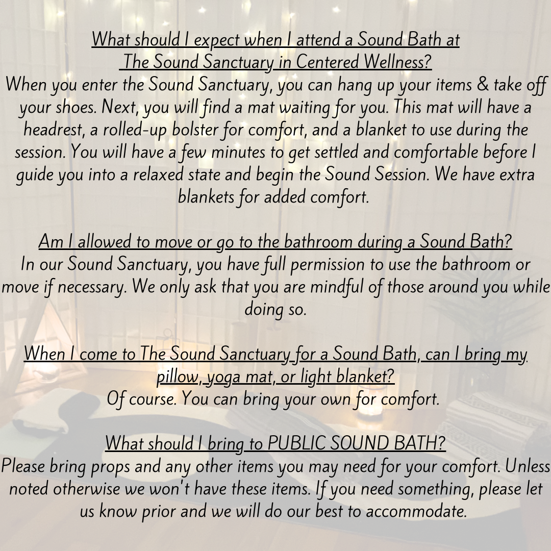 If your session is outside of The Sound Sanctuary at Centered Wellness NY, please bring any item that will help you maintain comfort. Examples such as: yoga mat, light blanket, and a towel to use under your head or knees (as you see fit).